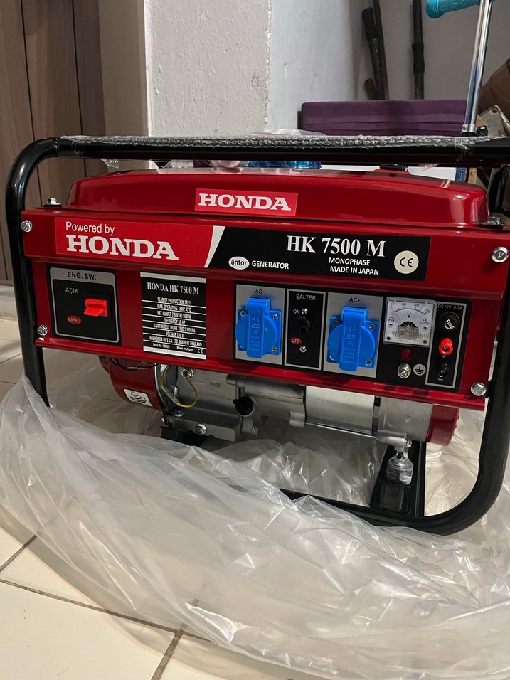Honda HK 7,5kawa jeneratör ipli benzinli , sıfır canlı kırmızı renkte. Çift priz, motor anahtarı ve voltaj göstergesi bulunur.05310345064