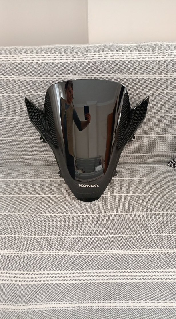 Honda motosiklet kaskı, şeffaf cam vizöre ve siyah-gri baskılı tasarıma sahip, minimalist ve avangart tarzda bir üründür. ️