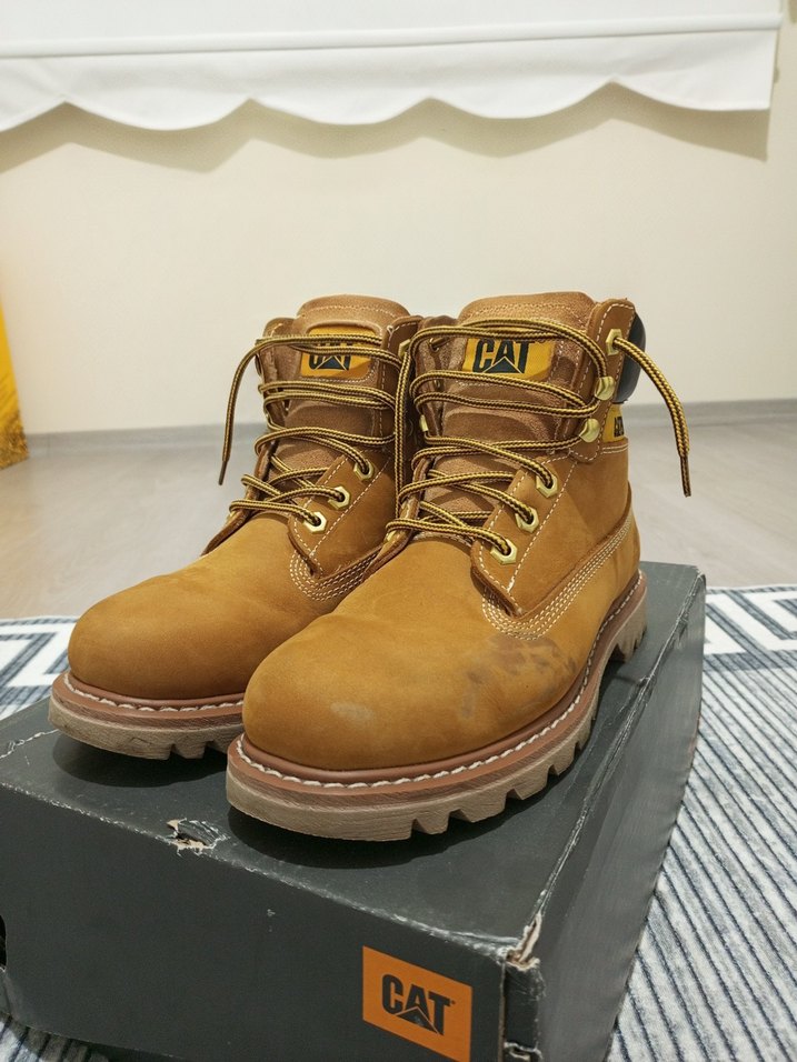 40 Numara Orijinal Su Geçirmez Nubuk deri Cat Bot. Sol tekindeki kalıcı olmayan iz dışında hiçbir leke, defo, açılma ve benzeri şeyler yoktur. Bahsettiğim iz herhangi bir nubuk temizleme fırçası veya silgisiyle kolayca geçebilecek yüzeysel bir izdir. Fırça ve silgi elimde bulunmuyo. Deforme olmaması için bezle veya farklı bir şeyle müdahale etmedim. 3 ay önce alındı ve sadece 3 kez giyildi. 40 numara bana uymadığı için satıyorum.