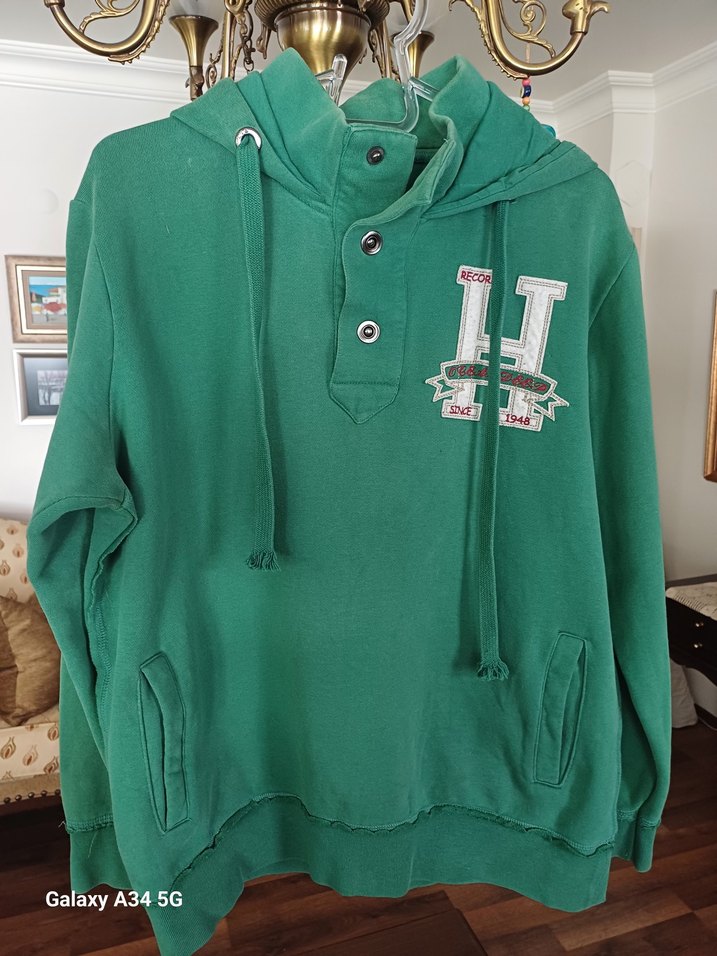 Rahat kesim, uzun kollu, kapüşonlu ve fermuarlı yeşil sweatshirt. Yumuşak ve sıcak kumaştan, baskılı desenli, gündelik kullanım için uygun.ön orta bel kemerinin orada minik bir defo vardır.katlanan yer olduğu için görünmemektedir.fiyat düşük tutulmuştur