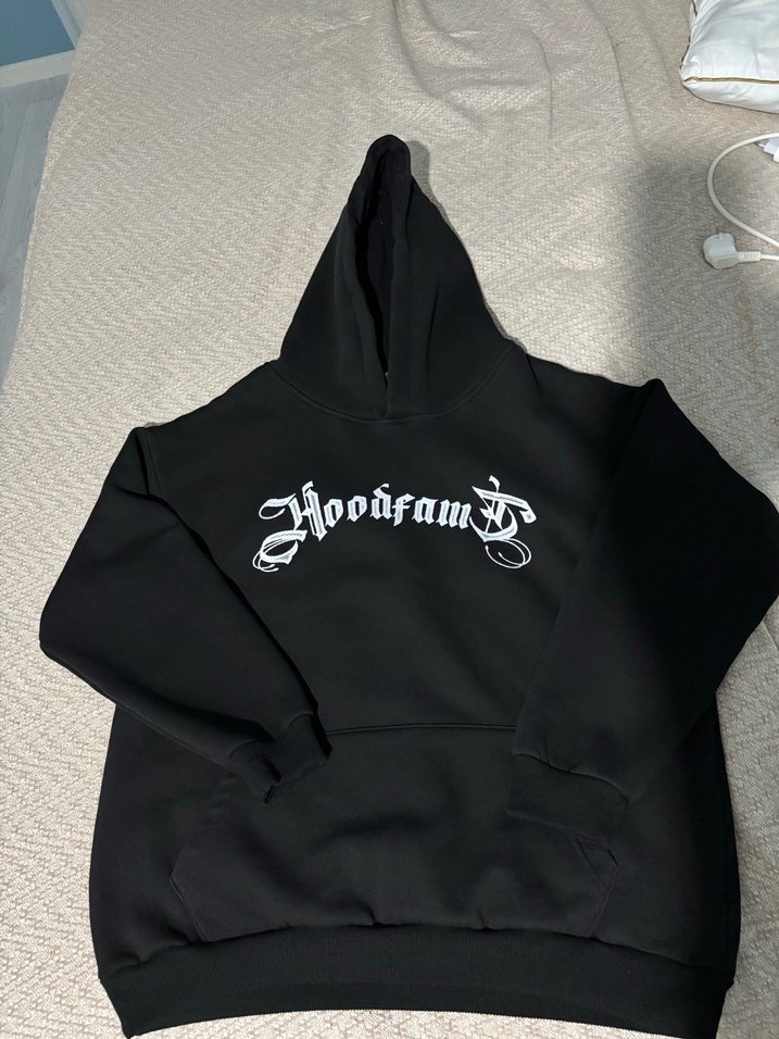 Siyah kapüşonlu sweatshirt, uzun kollu ve bol kesimdir. Yumuşak ve sıcak kumaştan üretilmiştir. Önünde baskılı tasarımı vardır.