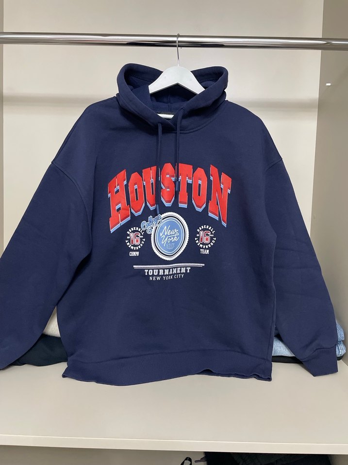 Koyu mavi, kapüşonlu, uzun kollu kadın sweatshirt. Houston baskılı, düğme detaylı ve bol kesimdir. Yumuşak ve sıcak kumaştan üretilmiştir.