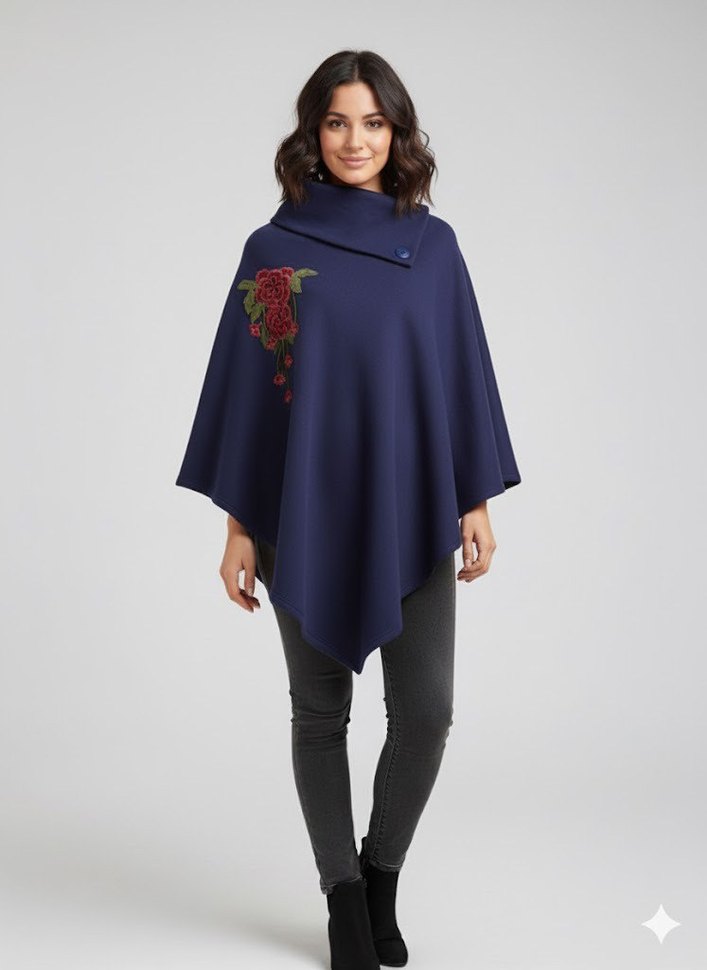 Lacivert renkte, yüksek yakalı kadın panço. Rahat ve dökümlü kesimi, nakışlı desenleri ile günlük kullanıma uygun bohem tarzda.