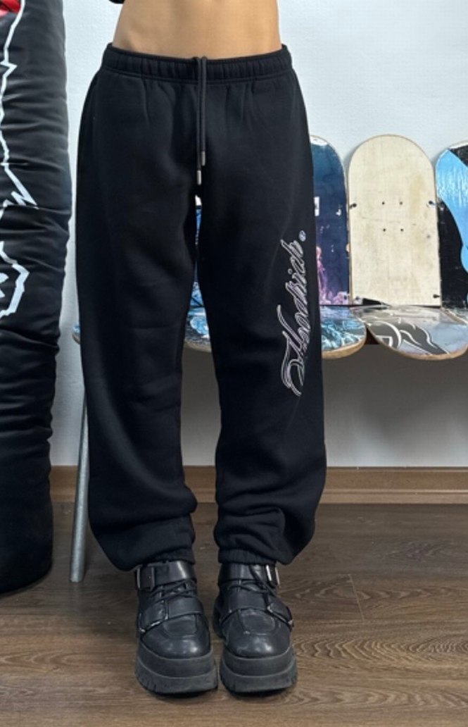 Siyah baskılı, bol kesim kadın sweatpant. Yumuşak fleece kumaştan, rahat ve şık günlük kullanım için uygun.