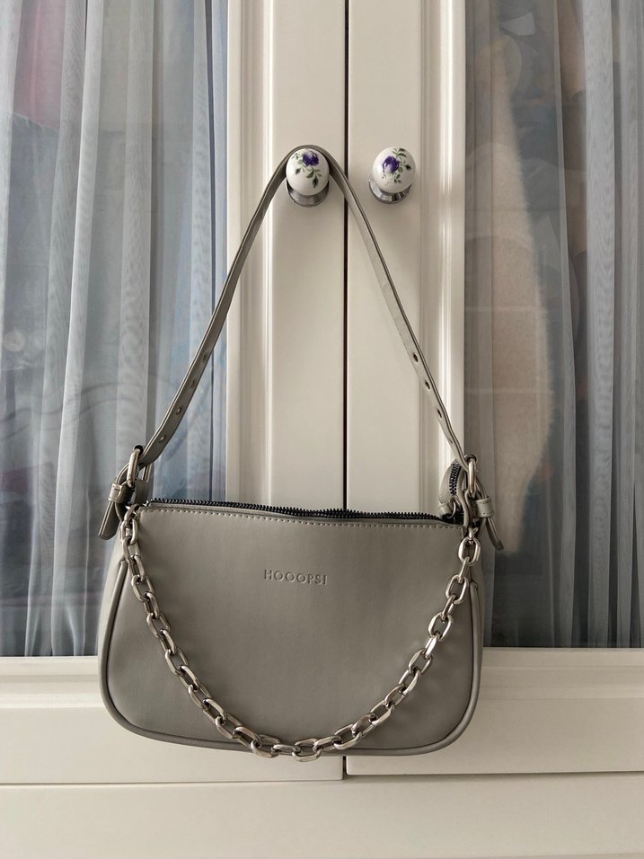 Gri renk, zincir detaylı çanta. Gözüktüğü gibidir içi epey geniş . Az kullanıldı