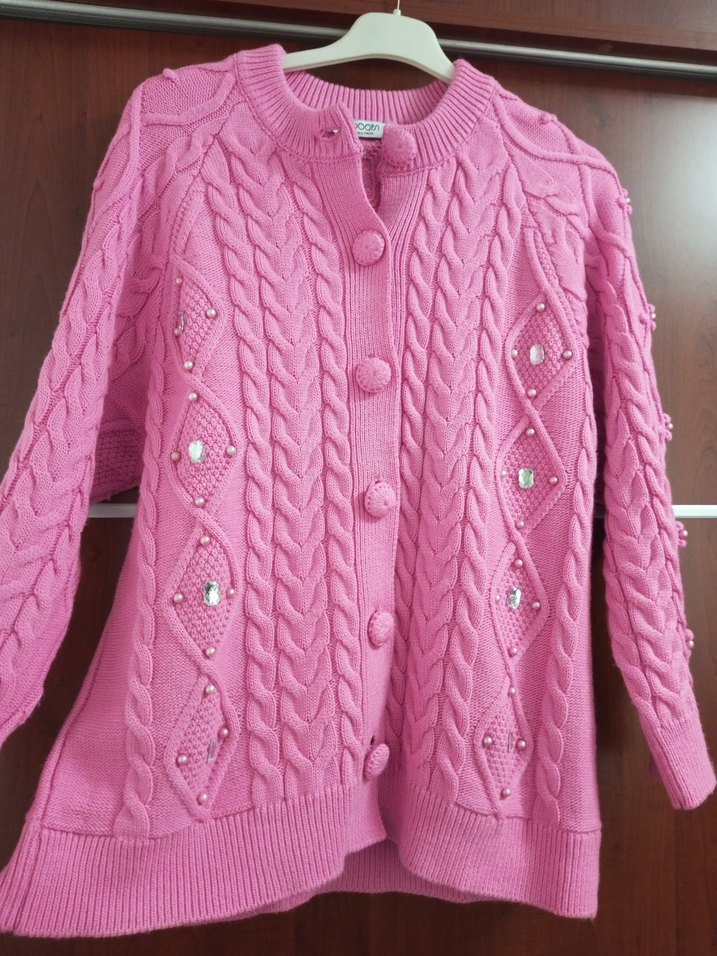 Pembe renkli, çiçek aksesuarlarıyla süslenmiş örme hırka. 162 boyundayim kalçamı kapatiyor standart beden 60 kiloya oversize duruyo prenses gibi hissettiren bir hırka pantolon ve etekle kombinlemeye uygun