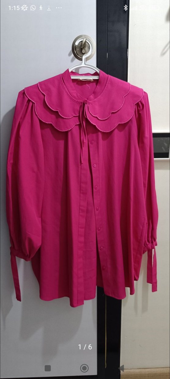 Pembe renkli, fırfırlı yakalı ve uzun kollu midi uzunluğunda, bol kesim gömlek. İpek gibi yumuşak kumaştan üretilmiş, desensiz ve ofis kullanıma uygun.