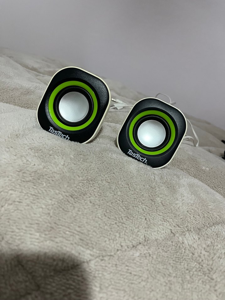 Yeşil renk detaylı, taşınabilir ve renkli tasarıma sahip kompakt hoparlörler. Ürün beyaz renkte fakat dolapta beklediği için rengi kreme dönmüş. Telefonumuzda uygun giriş yeri olmadığı için kullanamıyoruz, çalışır durumda.