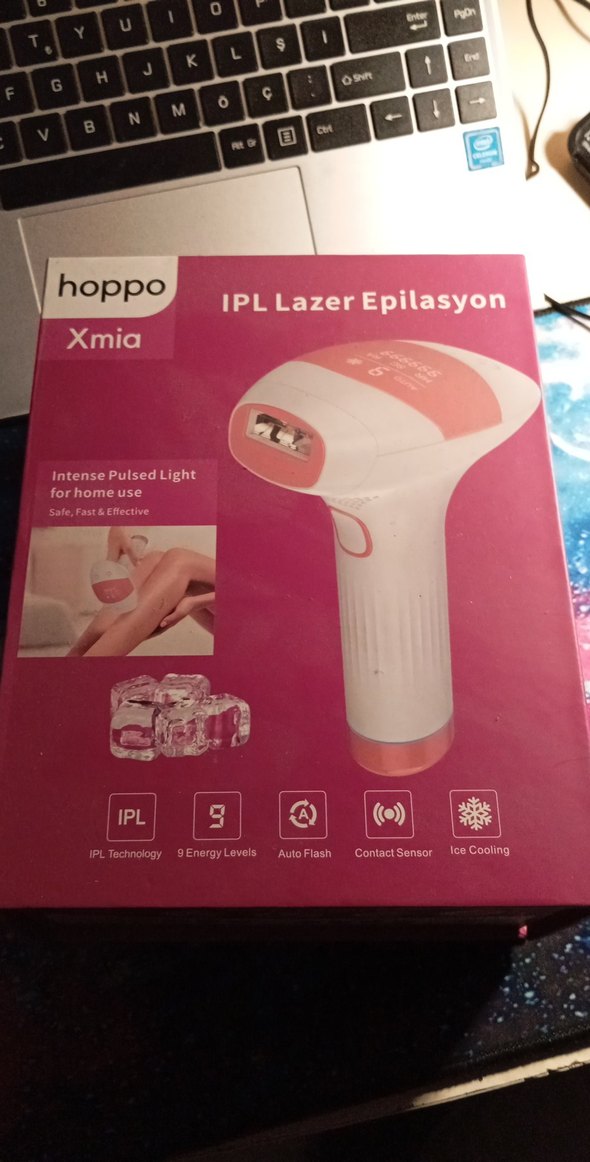 Hoppo Xmia IPL lazer epilasyon cihazı, 9 enerji seviyesi, otomatik flaş ve temas sensörü ile evde güvenli kullanım sağlar. Buz soğutma özelliği konfor sunar. neredeyse hiç kullanmadım tertemiz ürün.