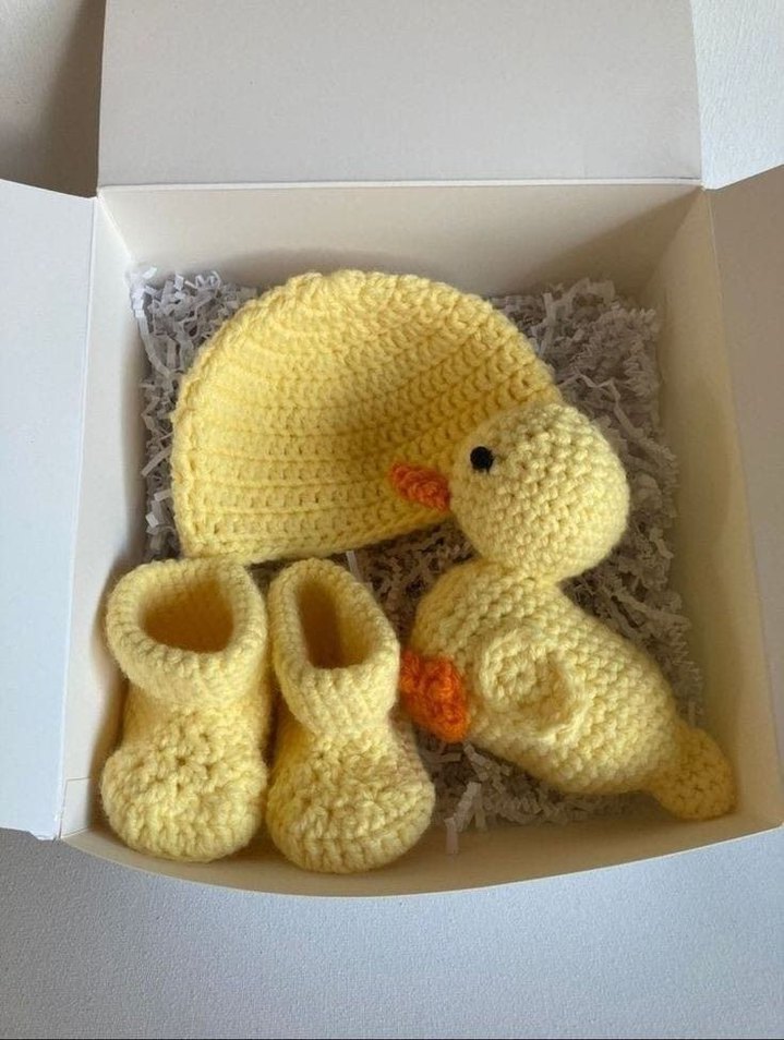 Yumuşak örgüden yapılmış sarı bebek patikleri, eşleşen bere ve ördek şeklinde oyuncak içeren set. Pastel sarı renk sade ve yumuşak bir görünüm sağlar.