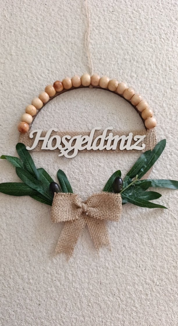 Ahşap boncuklar, yeşil yapraklar ve keten fiyonk ile 'Hoşgeldiniz' yazılı, haki renkli kapı süsü.