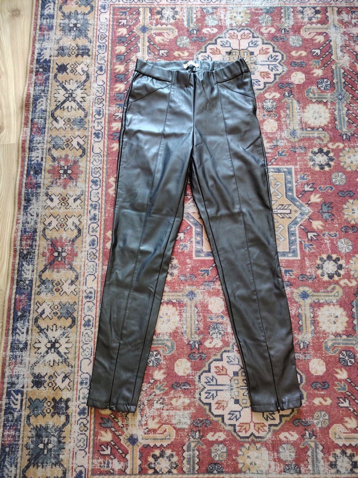 hot fashion, dar kesim siyah deri pantolon, L beden boyu 99 cm bel lastikli yandan fermuarlı paça on kisimlarindada fermurli