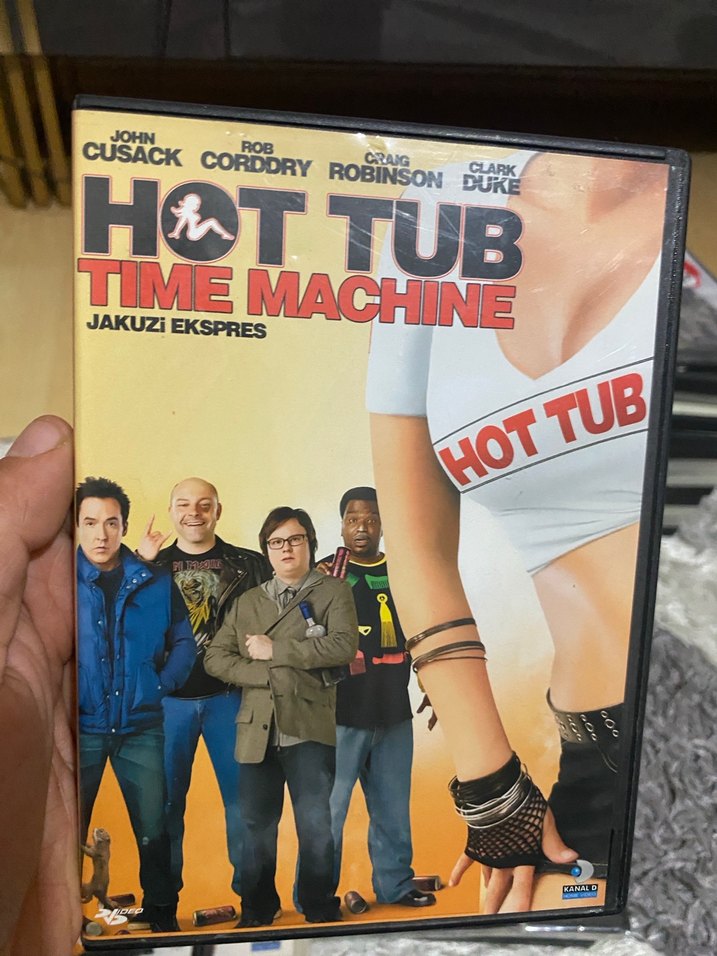 John Cusack ve diğer oyuncuların yer aldığı "Hot Tub Time Machine" filmi DVD'si. Kapakta dört erkek ve beyaz kıyafetli bir kadın yer alıyor.
