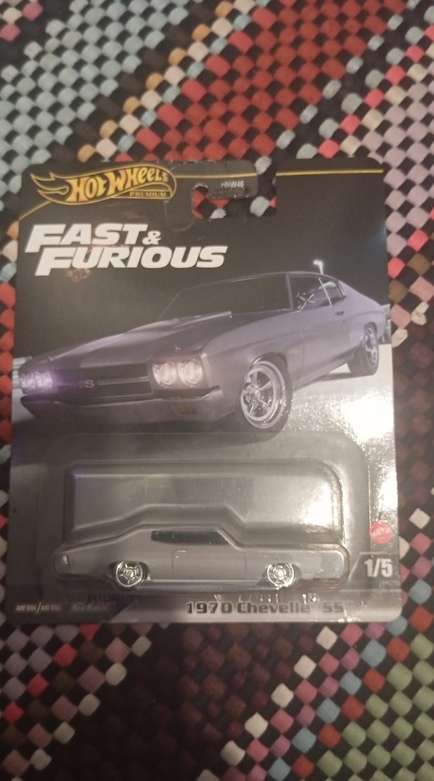 Hot Wheels Fast & Furious serisine ait koyu gri renkte 1970 Chevelle SS oyuncak araba. Gerçekçi detaylara sahip.