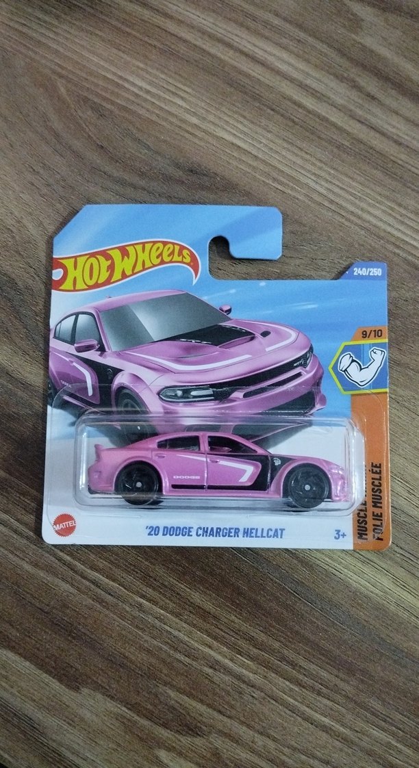 '20 Dodge Charger Hellcat modelinde koyu pembe Hot Wheels oyuncak araba. 9/10 puan, 3 yaş ve üzeri için uygundur. Kaslı araba tasarımı ve detaylı özellikler içerir.