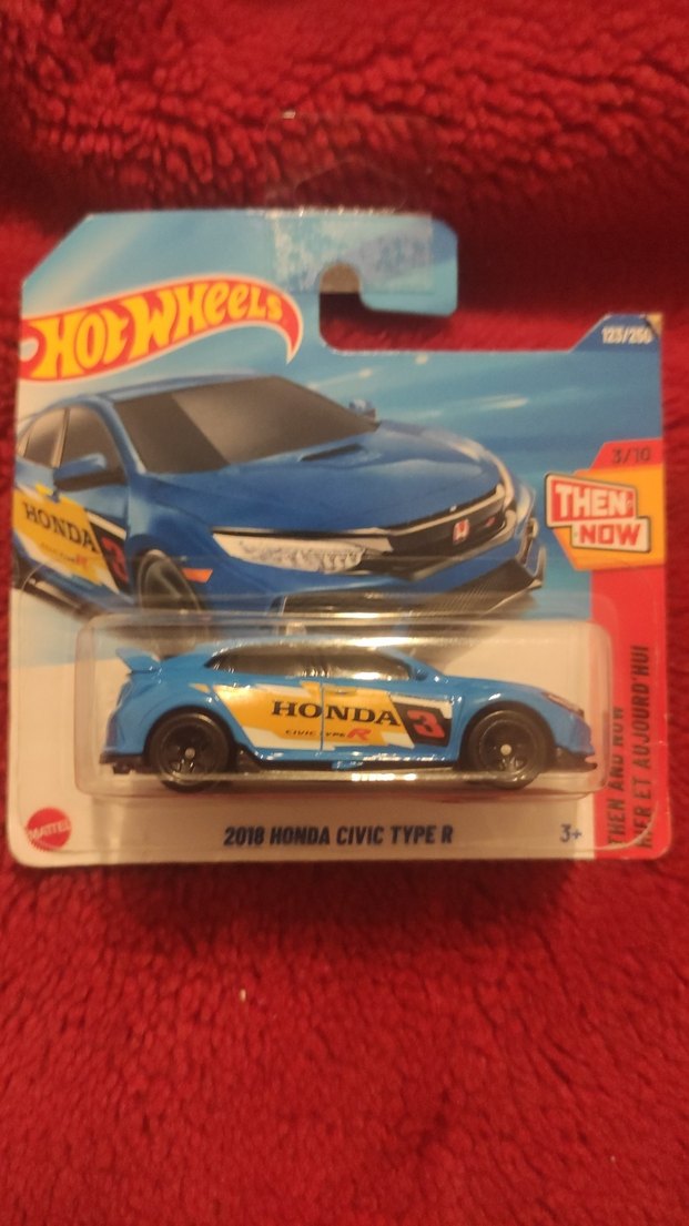 Bu Hot Wheels oyuncak araba, koyu mavi renkte 2018 Honda Civic Type R modelidir ve detaylı çıkartmalar ile siyah tekerleklere sahiptir. Honda logosu ve yarış tasarımı bulunur.