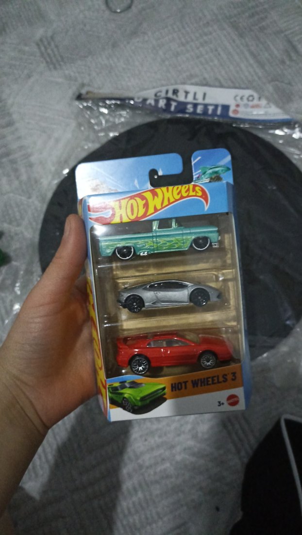 Hot Wheels 3'lü set, farklı tarzlarda ve koyu renklerde canlı oyuncak arabalar içerir. Paket üzerinde HOTWHEELS3 yazılıdır.