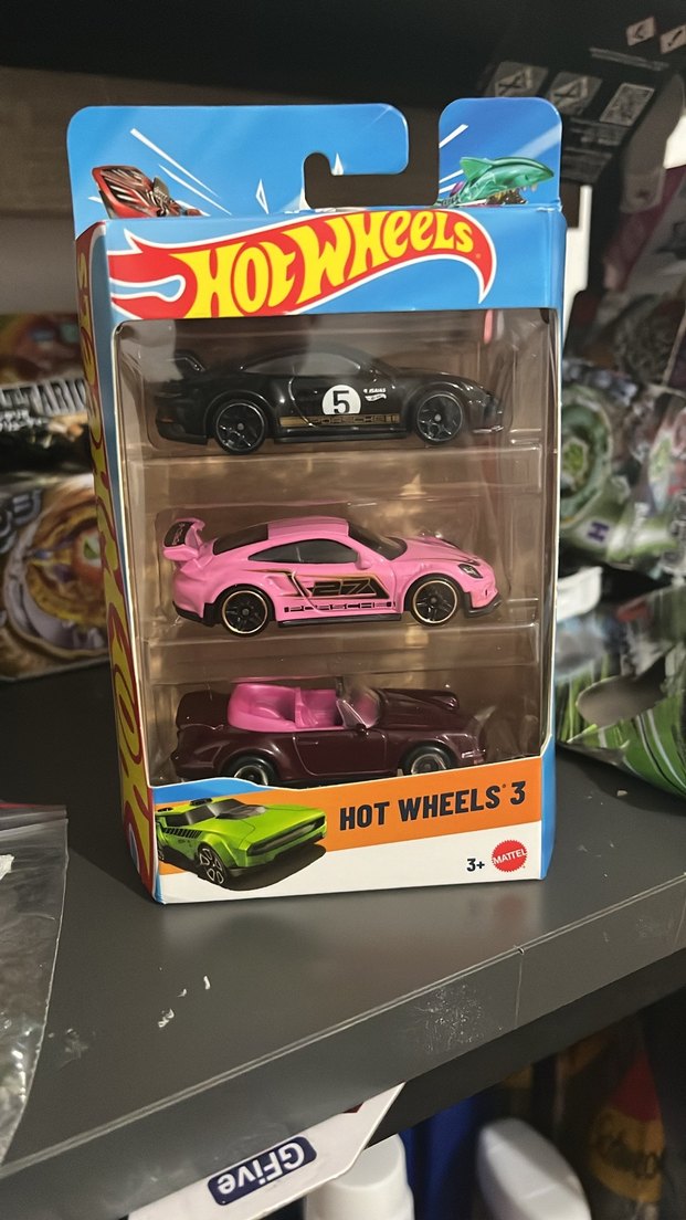 Hot Wheels marka, koyu ve pembe renklerde üç oyuncak araba seti. İçinde şık pembe spor araba bulunur hasarsız