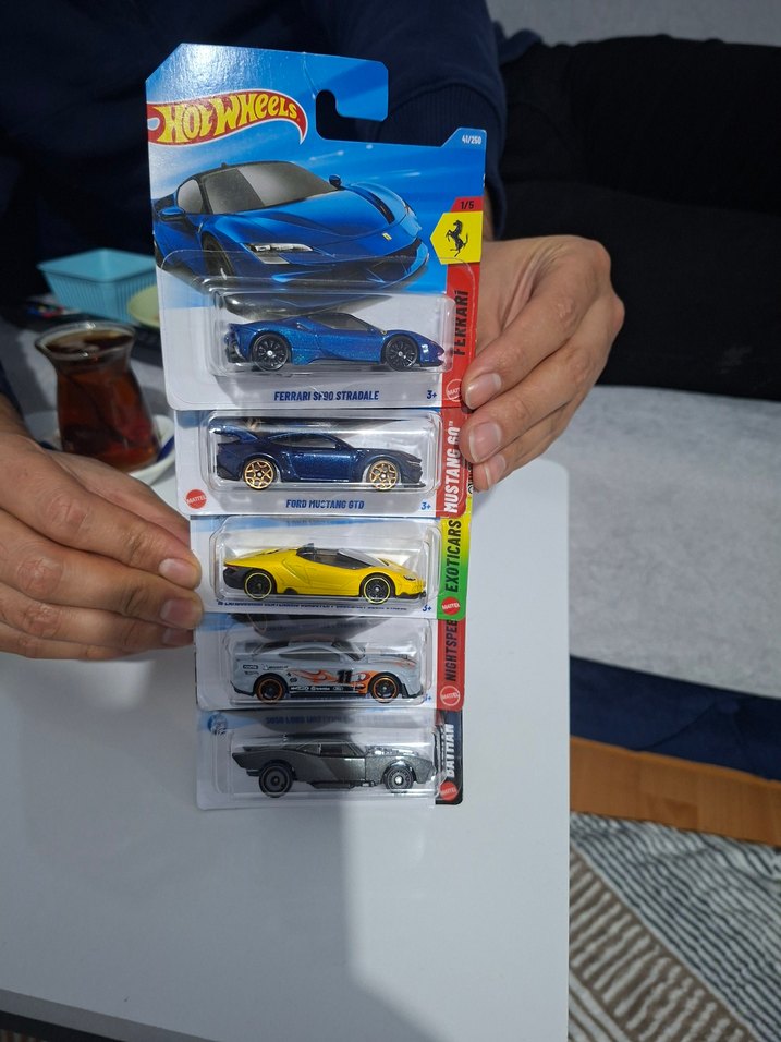 Beş farklı renk ve tasarıma sahip Hot Wheels oyuncak araba seti, koleksiyon veya oyun için uygundur.