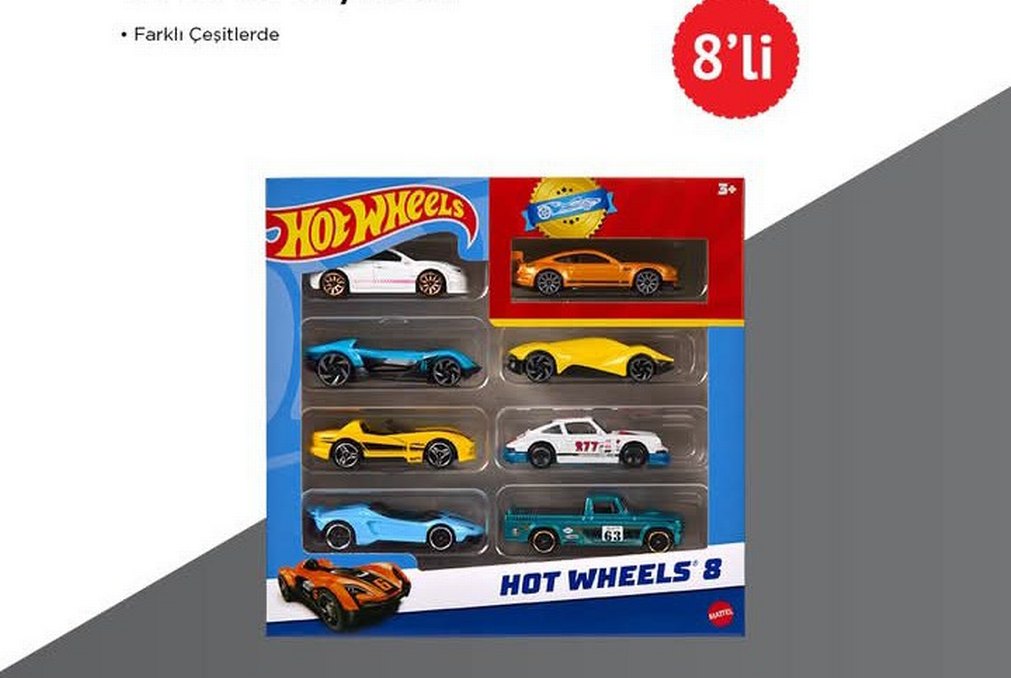 Hot Wheels 8 parçadan oluşan çok renkli oyuncak araba seti, farklı tasarımlara ve canlı renklere sahip.