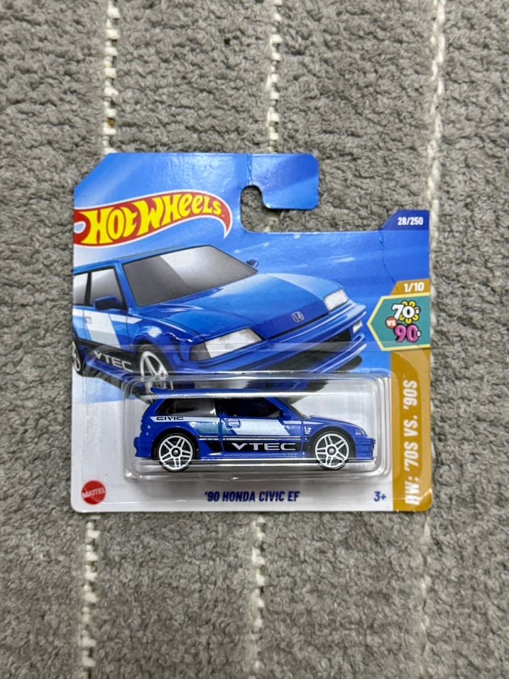 Hot Wheels mavi renkli '90 Honda Civic EF model oyuncak araba, VTEC yazılı, 70s vs 90s serisinden, orijinal ambalajında.