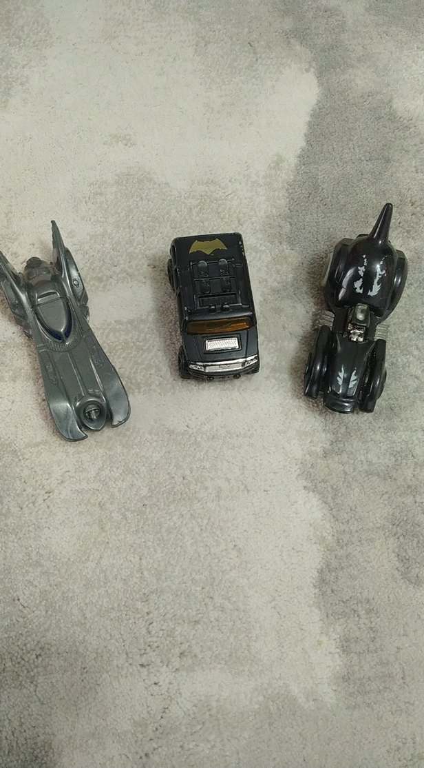 Üç farklı tasarıma sahip gri oyuncak araba seti. Birinde yarasa simgesi bulunur. Her arabanın detaylı şekli ve tekerlekleri vardır.