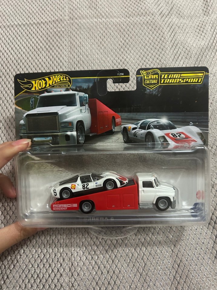Hot Wheels beyaz taşımacılık kamyonu ve 82 numaralı beyaz yarış arabası içeren oyuncak set. Paket üzerinde 'Hot Wheels' ve 'Team Transport' yazısı bulunur. Adet fiyatıdır