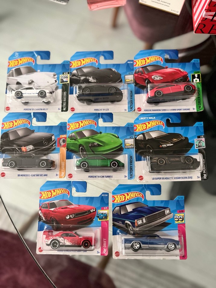 Hot Wheels markalı, çok renkli ve canlı tonlarda mini oyuncak arabalar. Gerçek modellere benzer detaylı tasarımlara sahip.