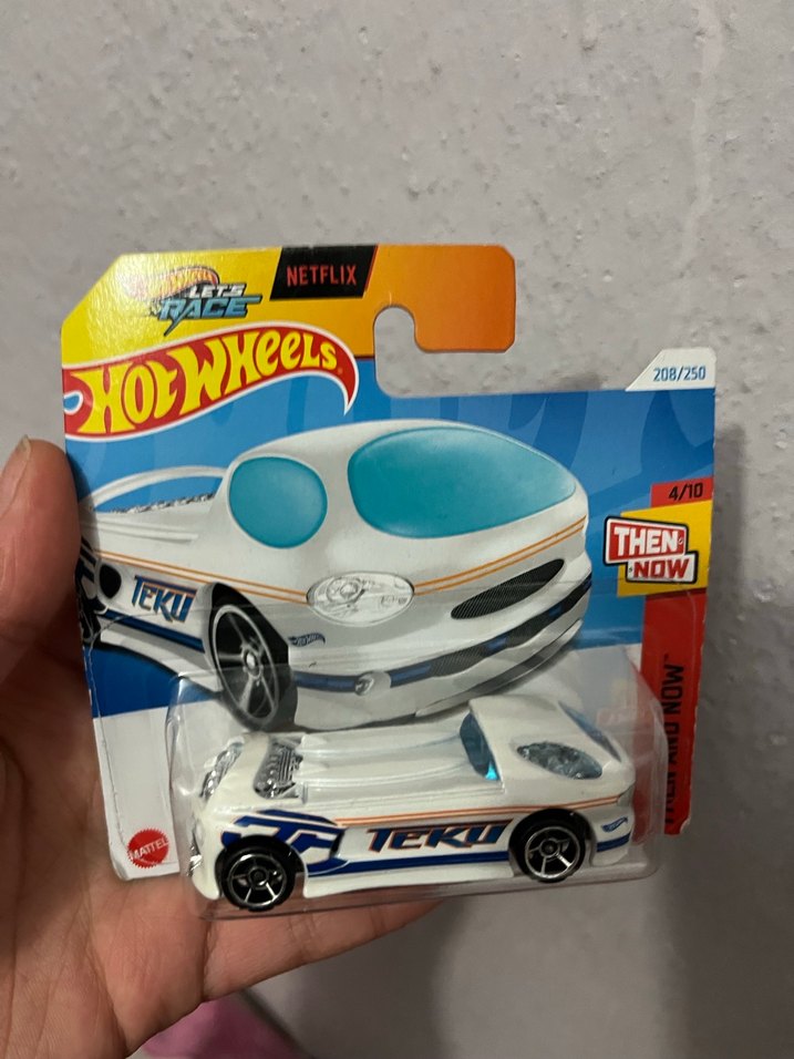 Hot Wheels beyaz gövdeli ve mavi TEKU yazılı oyuncak araba. Netflix serisine ait, 208/250 numaralı koleksiyonluk yarış tasarımı.