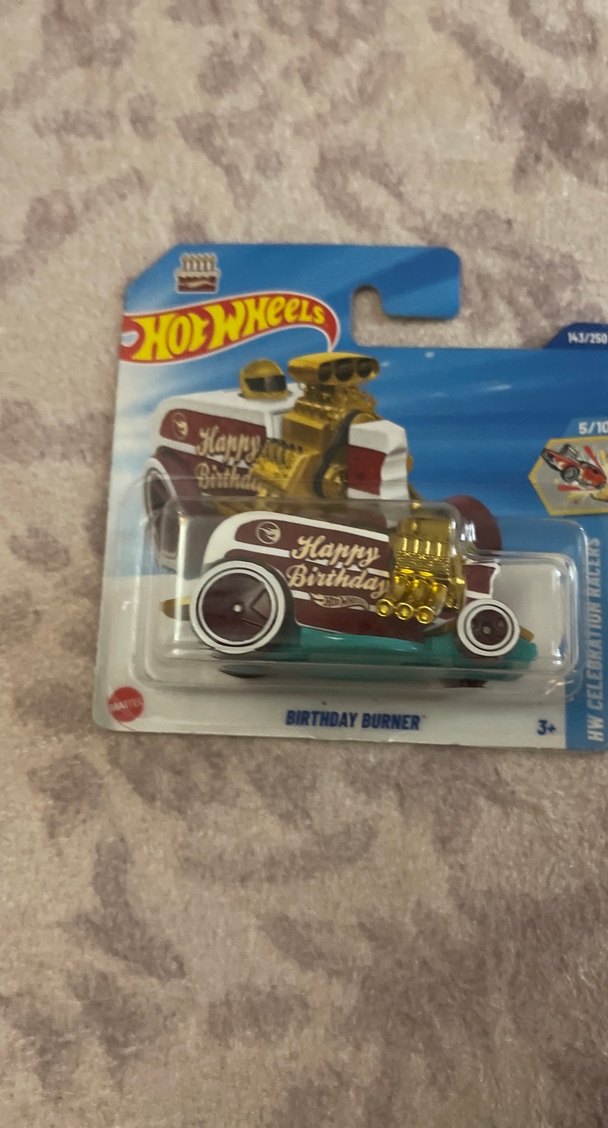 Gold motorlu ve "Happy Birthday" yazılı Hot Wheels oyuncak araba, Birthday Burner modelidir. 3 yaş ve üzeri çocuklar için uygundur. Th