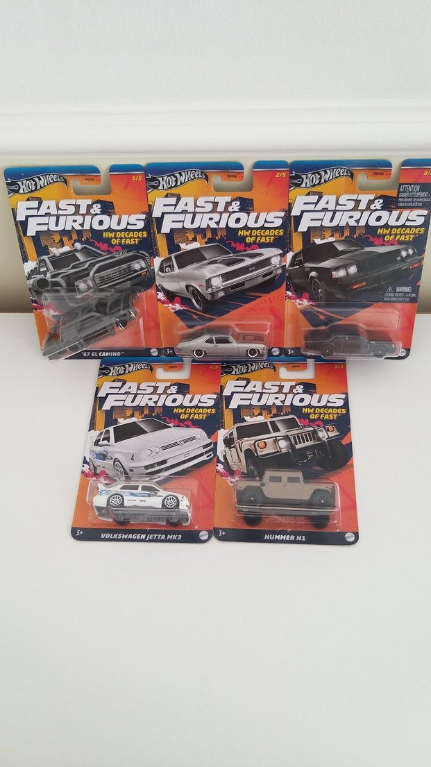 Popüler Fast & Furious serisinden Volkswagen Jetta ve Hummer H1 gibi modelleri içeren koyu gri Hot Wheels oyuncak arabalar seti.