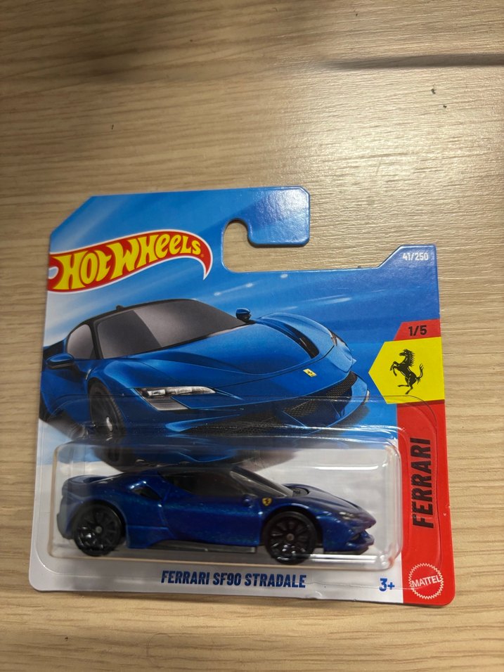 Koyu mavi Hot Wheels Ferrari SF90 Stradale oyuncak araba, detaylı tasarıma sahip ve orijinal ambalajında. 3 yaş ve üzeri için uygundur.