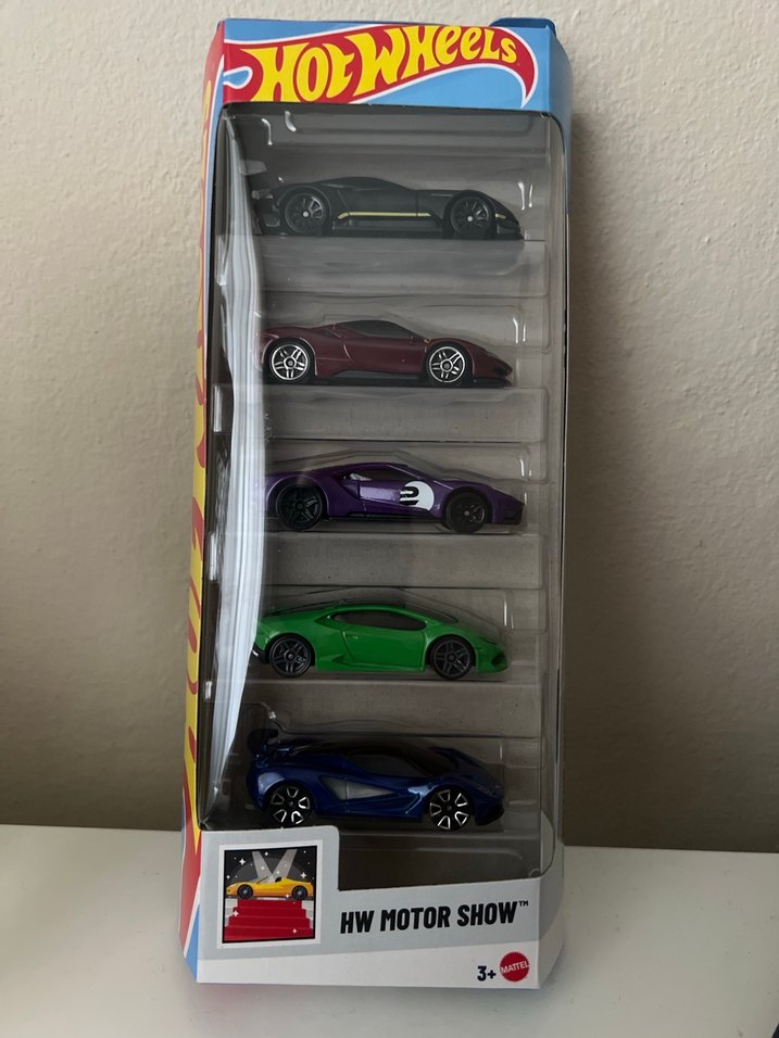 HW MOTOR SHOW etiketli, koyu tonlarda ve çok renkli 5 adet Hot Wheels oyuncak araba seti. 3 yaş ve üzeri için uygundur.