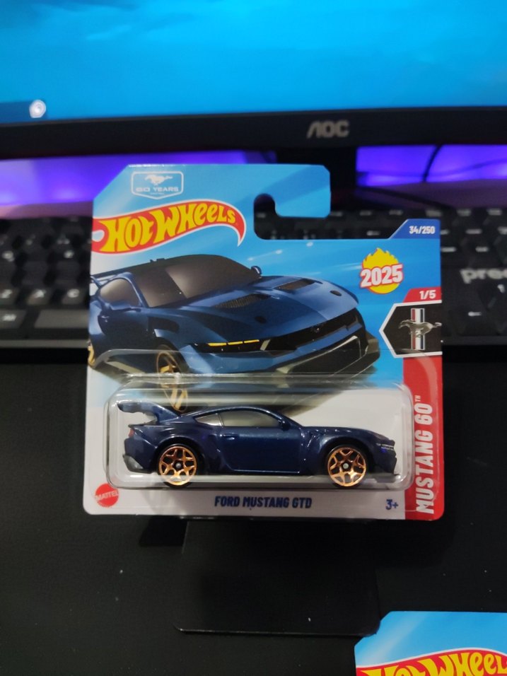 Koyu mavi Hot Wheels Ford Mustang GTD oyuncak araba, detaylı tasarım ve altın renkli jantlara sahip. 2025 Mustang 60 serisinden, 1/5.