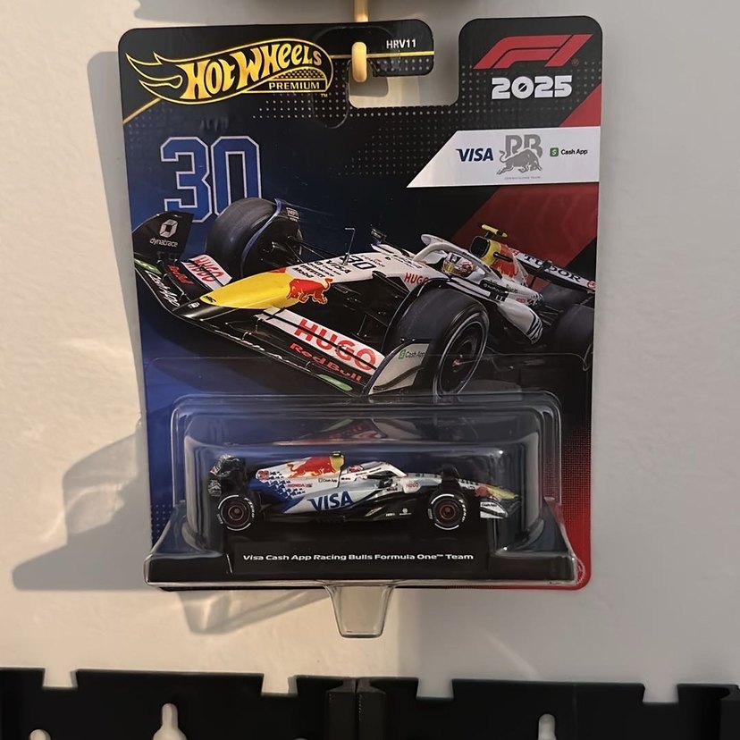 Hot Wheels 2025 Formula 1 Visa Cash App Racing Bulls takımı yarış arabası, koyu ve beyaz renklerde detaylı tasarıma sahip.