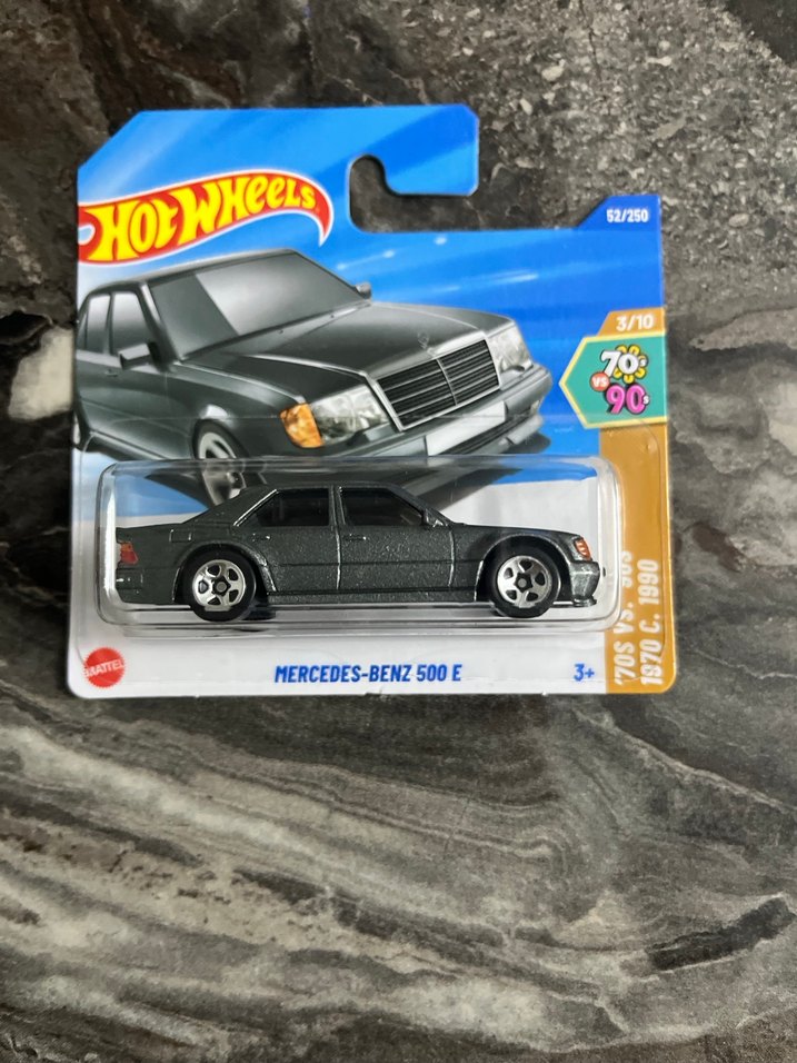 Hot Wheels gri Mercedes-Benz 500 E modeli oyuncak araba, detaylı tasarım ve pürüzsüz tekerleklerle, 3 yaş ve üzeri için uygundur.