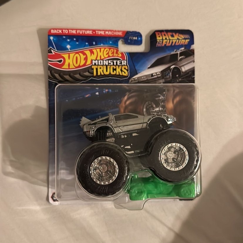 Back to the Future temalı, koyu gri renkte Hot Wheels monster truck. Büyük tekerlekleri ve detaylı tasarımıyla dikkat çeker.