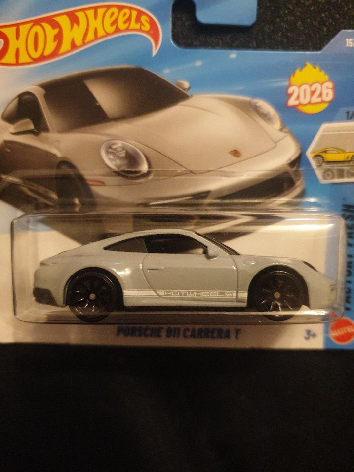 Hot Wheels markalı, siyah jantlı gri Porsche 911 Carrera T oyuncak araba. 2026 numaralı ve 3 yaş ve üzeri için uygundur.