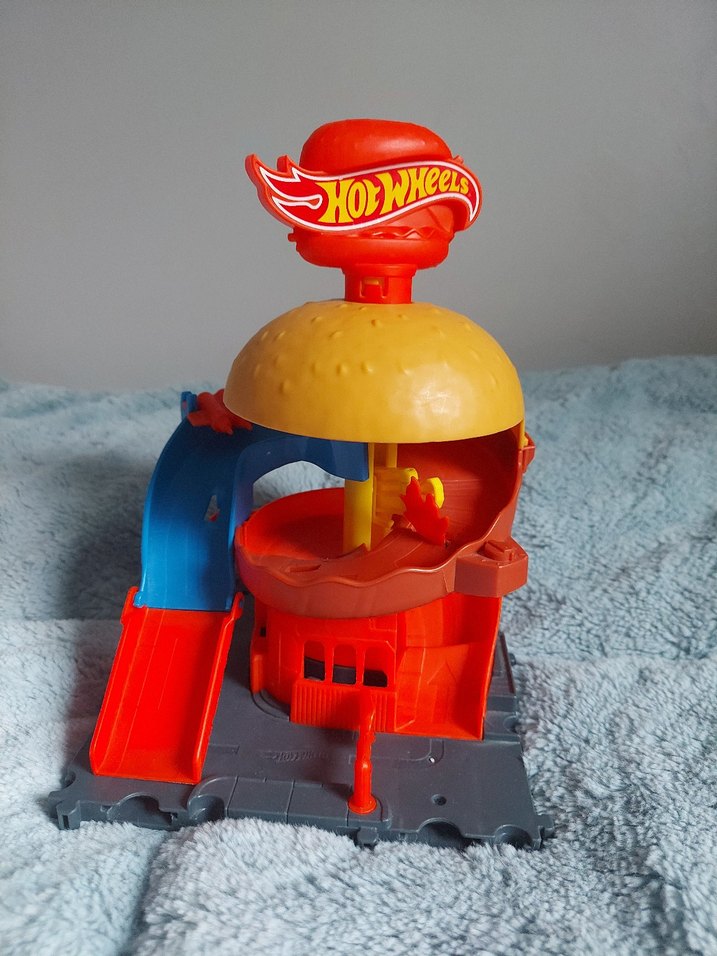 Hot Wheels renkli oyuncak araba oyun seti, rampalar ve spiral pist içerir. Eğlenceli oyun için uygundur.