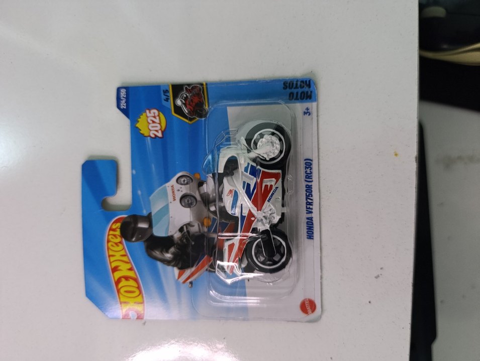 Beyaz Hot Wheels oyuncak motosiklet, Honda VFR750R (RC30) tasarımı ve detaylı çıkartmalar içerir. alana hayırlı olsun foto da görüldüğü gibi tertemiz model