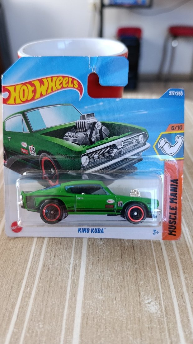 Hot Wheels King Kuda oyuncak araba koyu yeşil renkte, detaylı motor tasarımına sahip. Muscle Mania serisi, 217/250 numaralı modeldir.