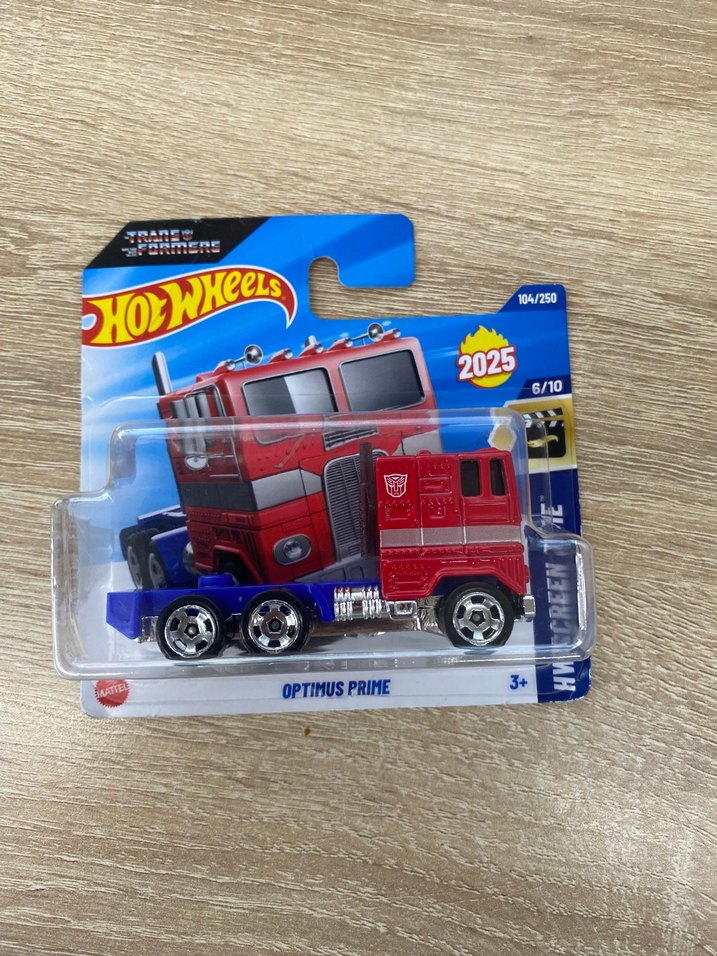 Hot Wheels oyuncak arabası, koyu kırmızı Optimus Prime kamyon tasarımına sahiptir. Detaylı tekerlekleri ve işaretlemeleri bulunur. 2025 koleksiyonundandır.