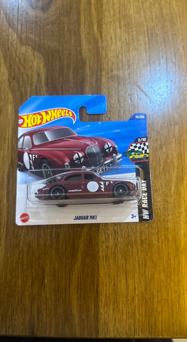 Hot Wheels oyuncak araba, koyu kırmızı Jaguar MK1 tasarımına ve yarış çıkartmalarına sahiptir. 3 yaş ve üzeri çocuklar için uygundur