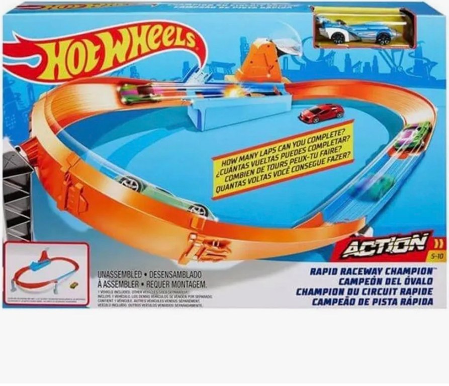 Hot Wheels mavi yarış pisti seti, renkli döngüler ve arabalar içerir. Montajsızdır ve tur tamamlama ile şampiyonluk yarışına davet eder.