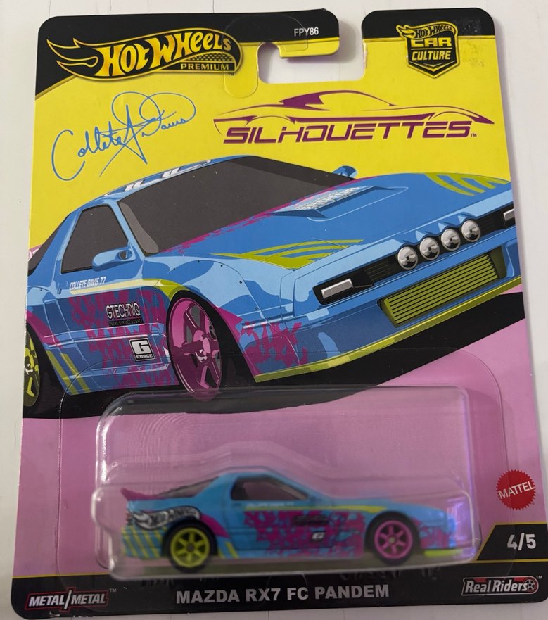Pastel mor renkte Hot Wheels Premium Mazda RX7 FC Pandem oyuncak araba, detaylı desenler ve renkli jantlarla Car Culture Silhouettes serisinden.