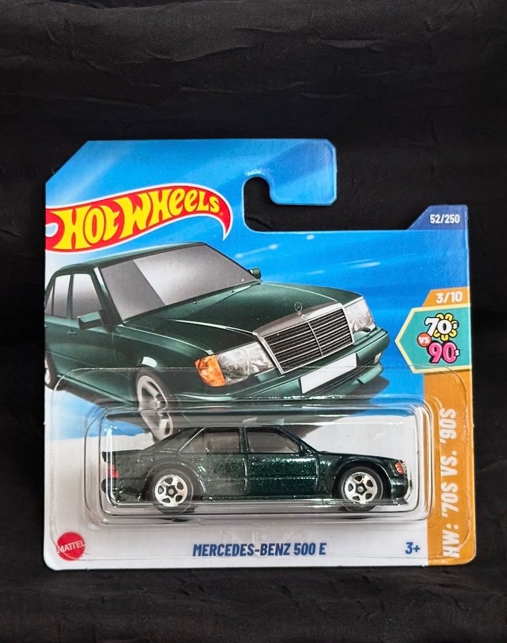 %100 kondisyonlu kartonet. Koyu yeşil Hot Wheels oyuncak araba, Mercedes-Benz 500 E modelidir. '70ler vs '90ler serisine ait, 3 yaş ve üzeri için uygundur.