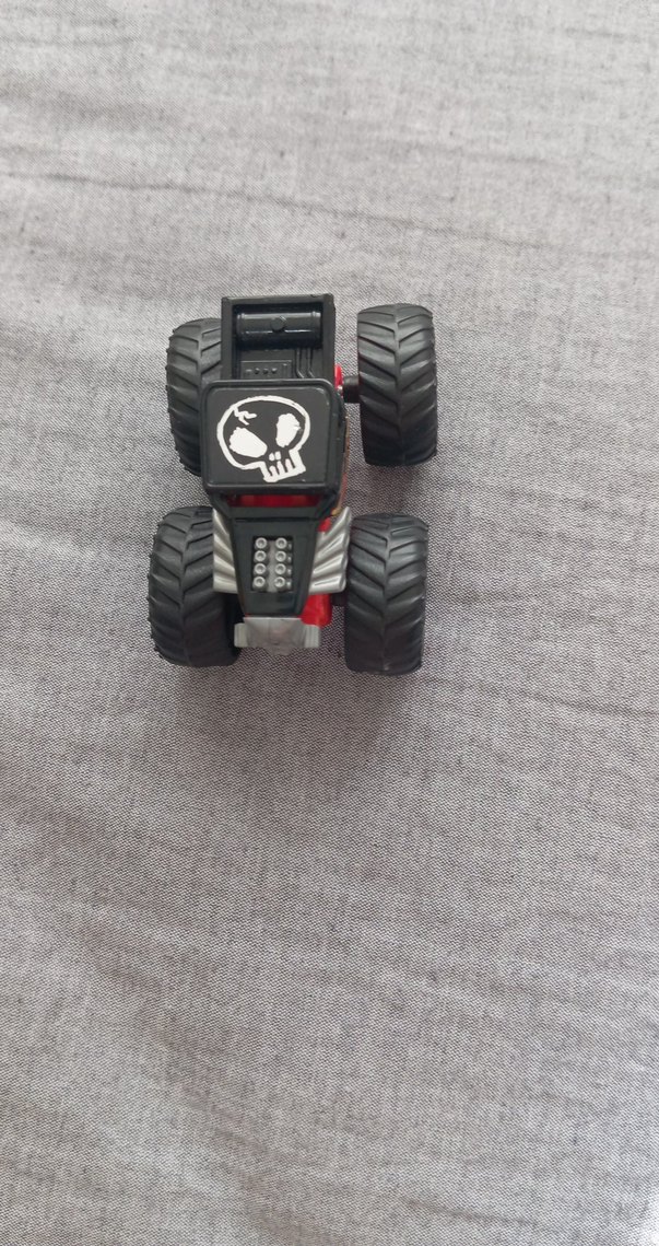 Büyük tekerlekli, kaputunda kafatası deseni olan siyah oyuncak araba. Hayal gücüne uygun sağlam görünümlü.