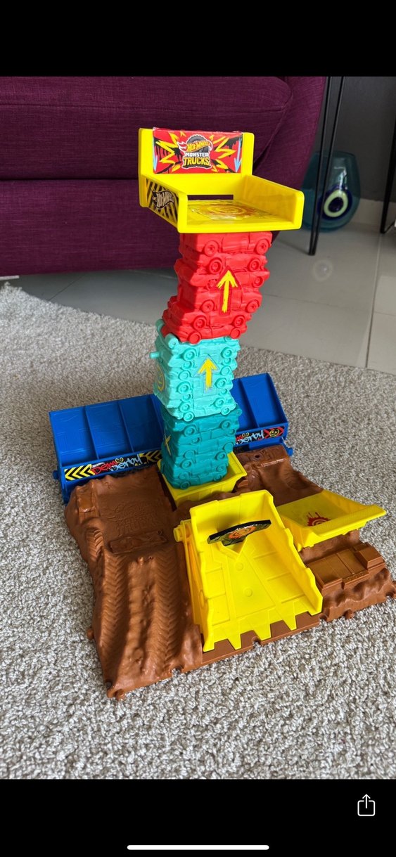Renkli parkuru seti, rampalar ve üst üste dizilen kule içerir. Canlı kırmızı, mavi, sarı ve kahverengi parçalar bulunur. Yenidir eğlenceli parkur