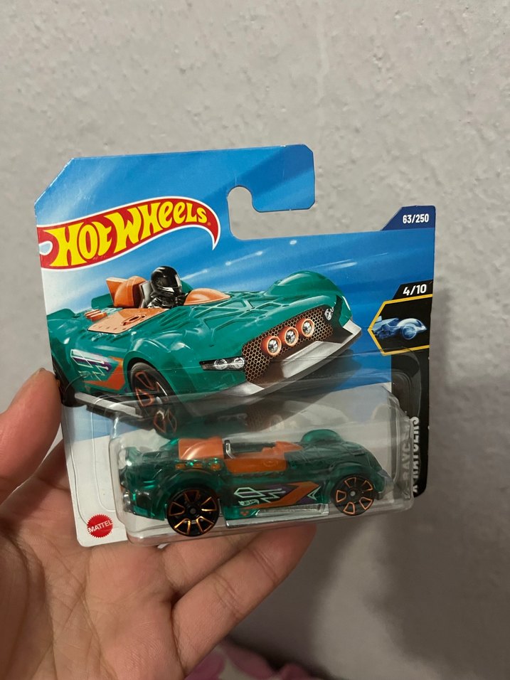Hot Wheels oyuncak araba koyu turkuaz renkli, turuncu ve siyah detaylara sahip. Seride 4/10 puanla koleksiyonun parçası.