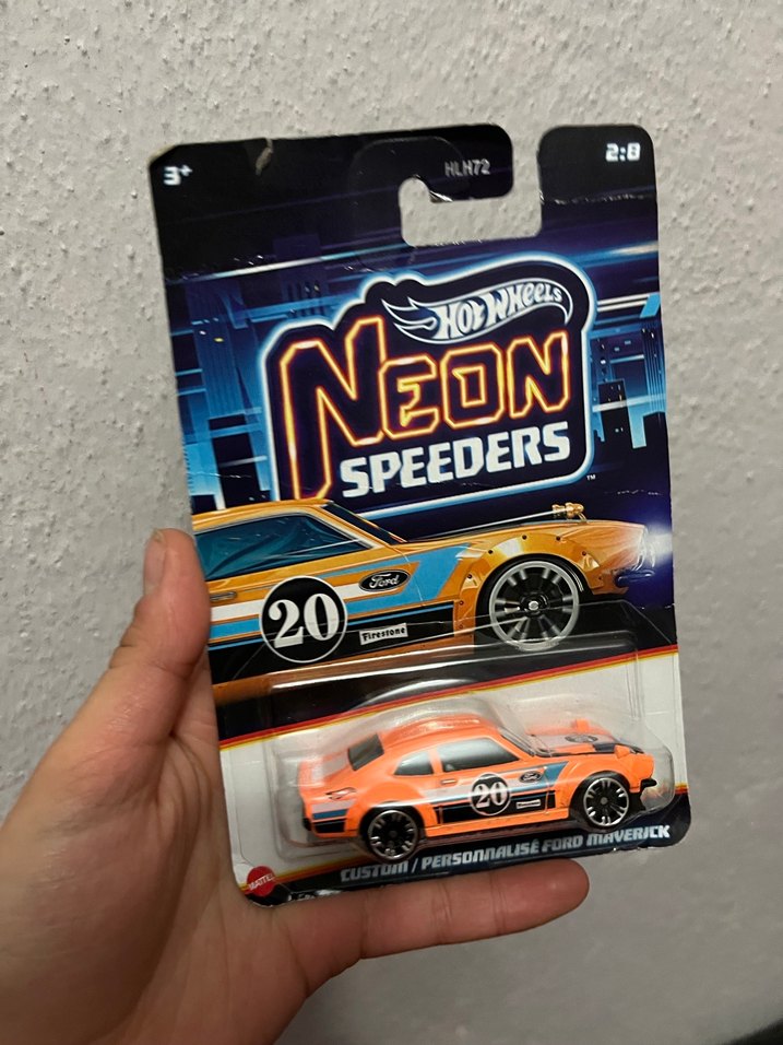 Turuncu ve siyah detaylara sahip Hot Wheels Neon Speeders oyuncak araba. Yanında 20 numara var. Özelleştirilebilir Ford Maverick modeli.